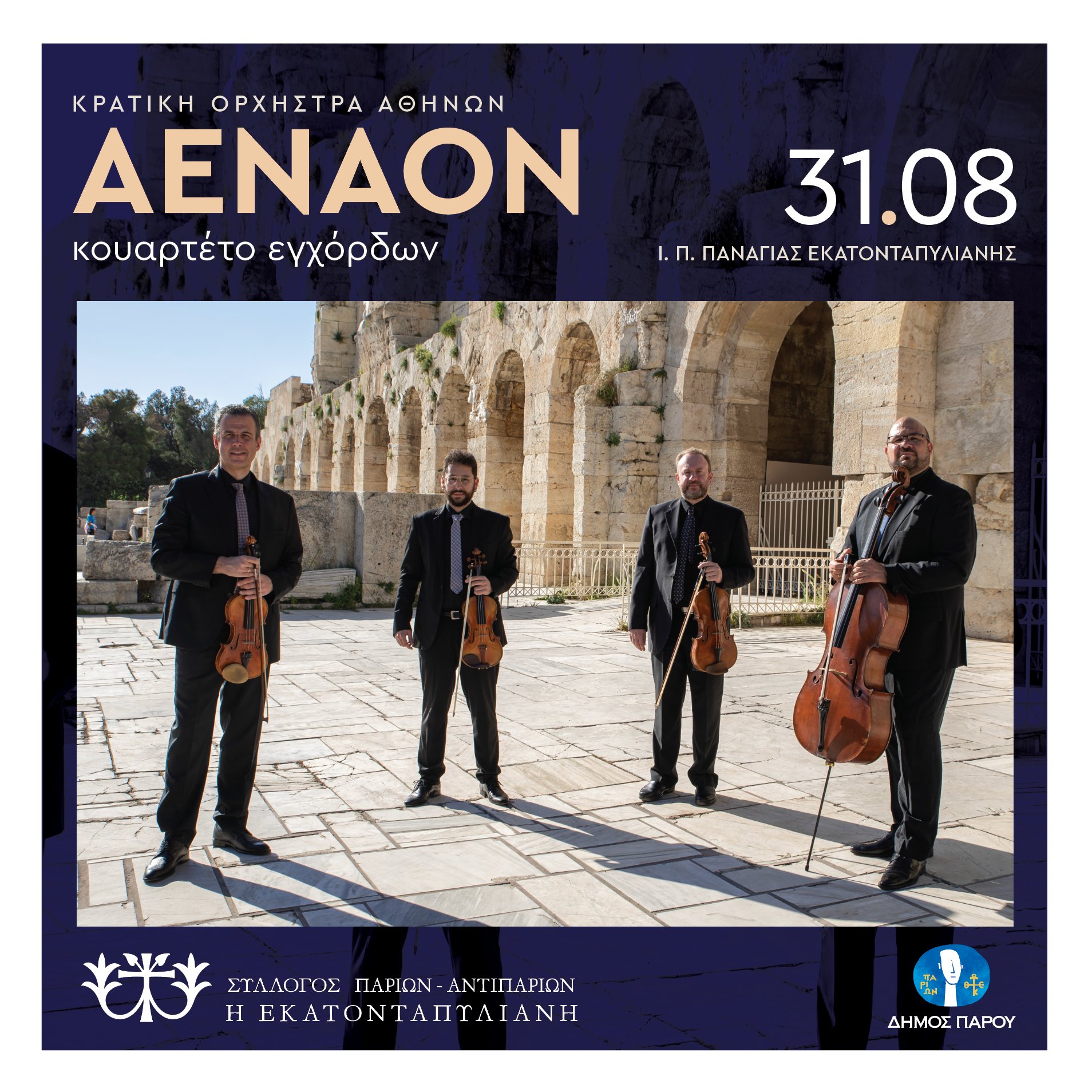 Ο Πολιτιστικός Σύλλογος Πάριων- Αντιπαρίων «Η ΕΚΑΤΟΝΤΑΠΥΛΙΑΝΗ» προσκαλεί το κοινό της Πάρου, στις 31 Αυγούστου 2025, ημέρα Κυριακή και ώρα 21:00, να απολαύσει μια μοναδική μουσική εμπειρία σε μια ατμόσφαιρα που υπόσχεται να ταξιδέψει τους θεατές μέσα από τις διαχρονικές μελωδίες της κλασικής μουσικής, σπουδαίων συνθετών, F. MENDELSSON, A.P.BORODIN, από το κουαρτέτο εγχόρδων ΑΕΝΑΟΝ.