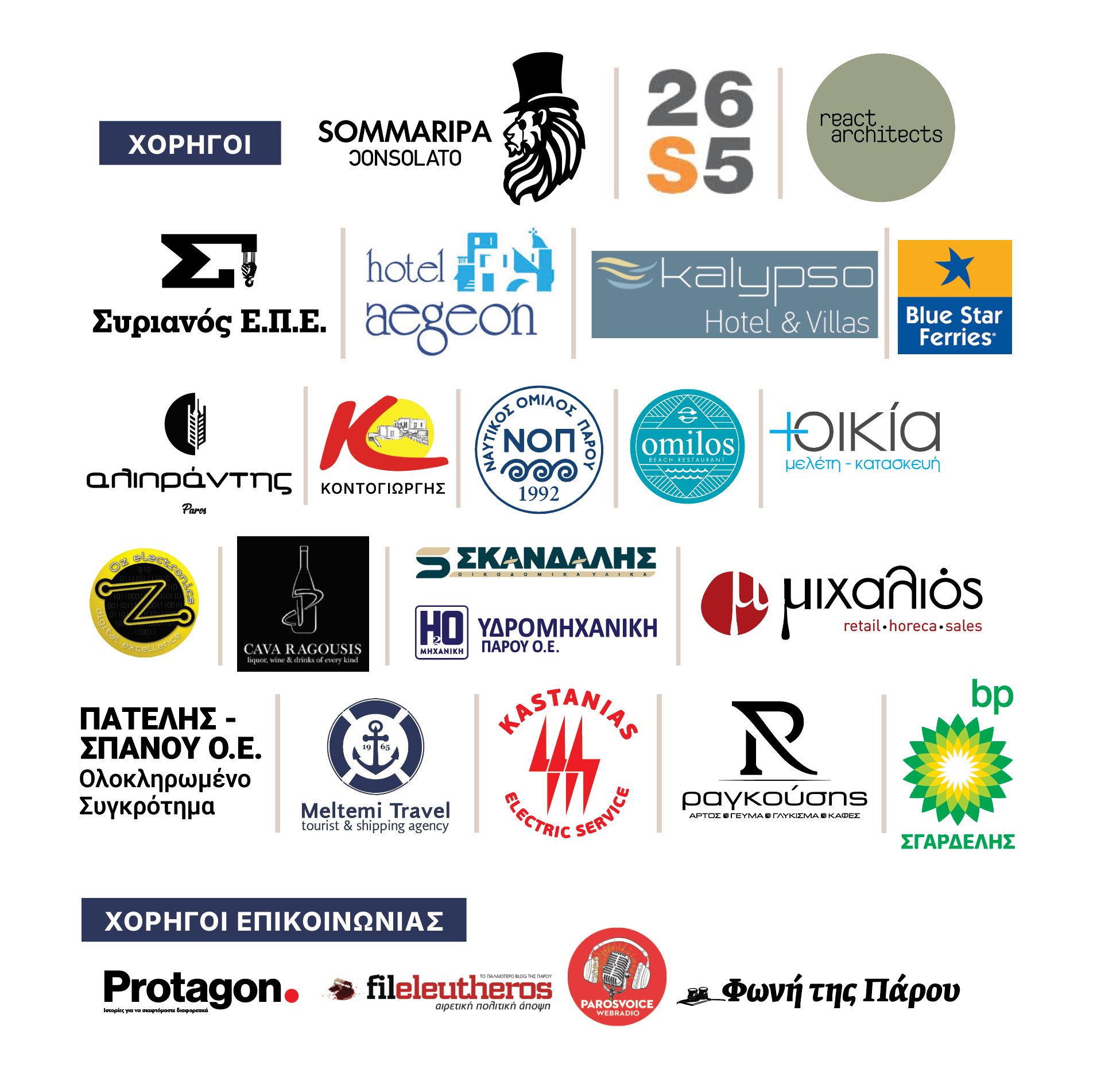 Η εκδήλωση πραγματοποιείται με την υποστήριξη του Δήμου Πάρου και των χορηγών μας, SOMMARIPA CONSOLATO, STUDIO 265, REACT-ARCHITECTS, ΣΥΡΙΑΝΟΣ ΕΠΕ, HOTEL AEGEON, KALYPSO HOTEL & VILLAS , ΑΛΙΠΡΑΝΤΗΣ CATERING , BLUE STAR, ΝΟΠ, OMILOS , SYN-OIKIA, ΠΙΕΡΤΖΟΒΑΝΝΗΣ ΣΥΝΑΓΕΡΜΟΙ, ΚΟΝΤΟΓΙΩΡΓΗΣ AE , S.ΣΚΑΝΔΑΛΗΣ ΑΕ, ΥΔΡΟΜΗΧΑΝΙΚΗ ΠΑΡΟΥ Ο.Ε, CAVA RAGOUSIS AE, ΜΙΧΑΛΙΟΣ ΑΕ, ΠΑΤΕΛΗΣ-ΣΠΑΝΟΥ ΟΕ, ΜΕΛΤΕΜΙ TRAVEL, ΚΑΣΤΑΝΙΑΣ, ΡΑΓΚΟΥΣΗΣ BAKERY, ΣΓΑΡΔΕΛΗΣ, και των χορηγών επικοινωνίας,PROTAGON, FILELEUTHEROS NET και ΦΩΝΗ της ΠΑΡΟΥ, τους οποίους και ευχαριστούμε θερμά για την συμβολή τους στην υλοποίηση αυτής της επετειακής βραδιάς.