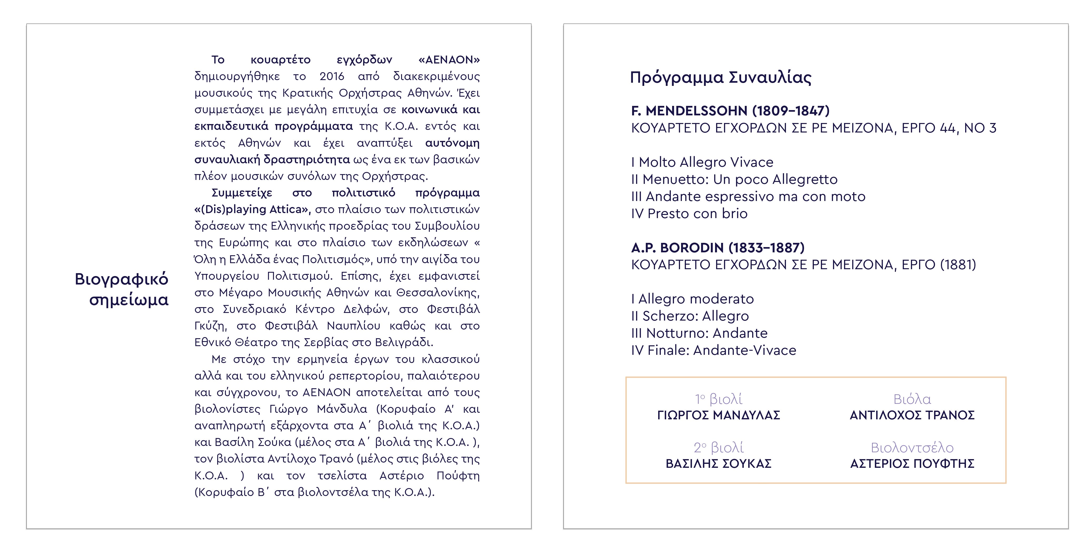 Το κουαρτέτο εγχόρδων «ΑΕΝΑΟΝ» είναι ένα από τα πιο σημαντικά σχήματα μουσικής δωματίου της χώρας, αποτελούμενο από καταξιωμένους μουσικούς της Κρατικής Ορχήστρας Αθηνών που ιδρύθηκε το 2016, με στόχο την ανάδειξη του κλασικού αλλά και του ελληνικού ρεπερτορίου – από τους μεγάλους συνθέτες του παρελθόντος έως τις σύγχρονες δημιουργίες.