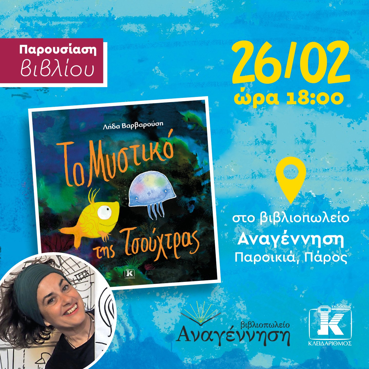 Leda Varvarousi, author of the children's book The Secret of the Jellyfish , will be at the Anagennisi bookstore in Paros on February 26 at 6:00 p.m. to sign copies of her book in her own unique way and introduce our young friends to Kitrini, the jellyfish, and the other characters in her book.